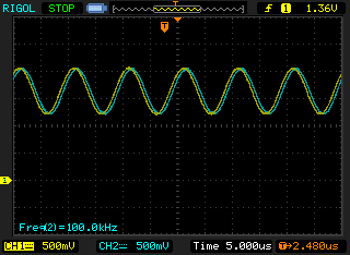 模塊:LDM1171;負載:7ohm功率電阻;黃色:100k正弦模擬調制信號,由AI口輸入(1.25V的偏置);藍色:AO測得的電流信號。